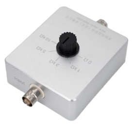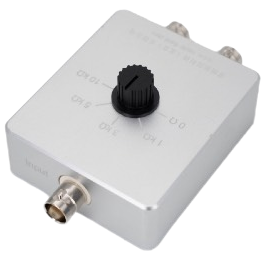 ⼀款可切换电阻值的标准电阻,提供5挡开关⽤于切换5挡不同的电阻值。两种规格分别为“⼀转⼆”:用于将⼀条同轴线缆的芯和壳分接⾄两个BNC的芯上,同时串联可变电阻; “⼀转⼀”:用于直接在两个BNC连接器之间串联电阻。