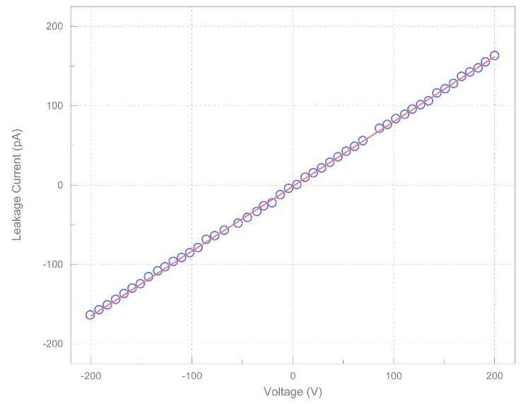 在不安装样品的情况下,让两通道之间保持断路,在通道间施加电压,测试此时的电流大小。为了获得可靠的测试结果,我们选用了Angilent BA500半导体分析仪进行测试