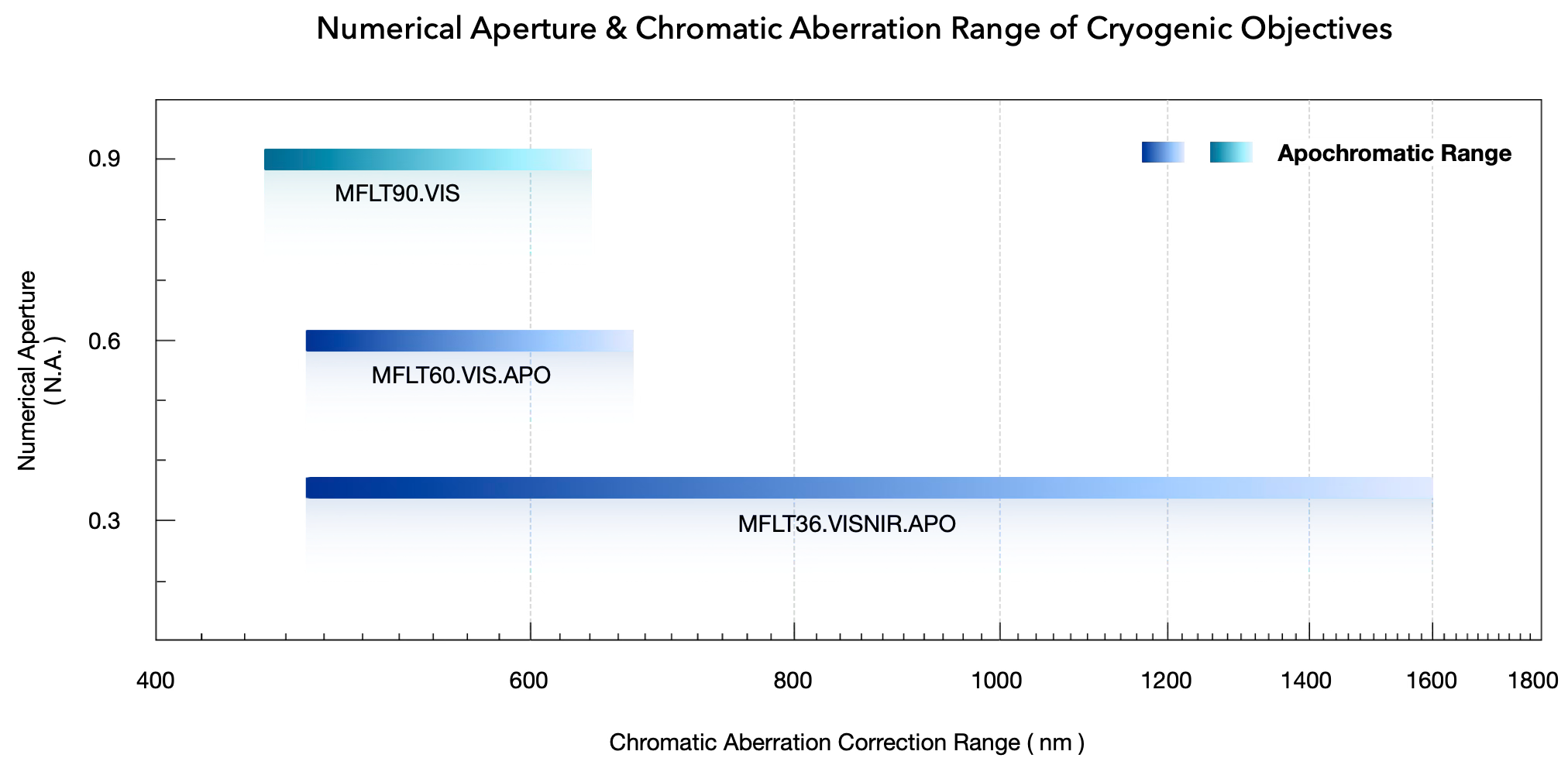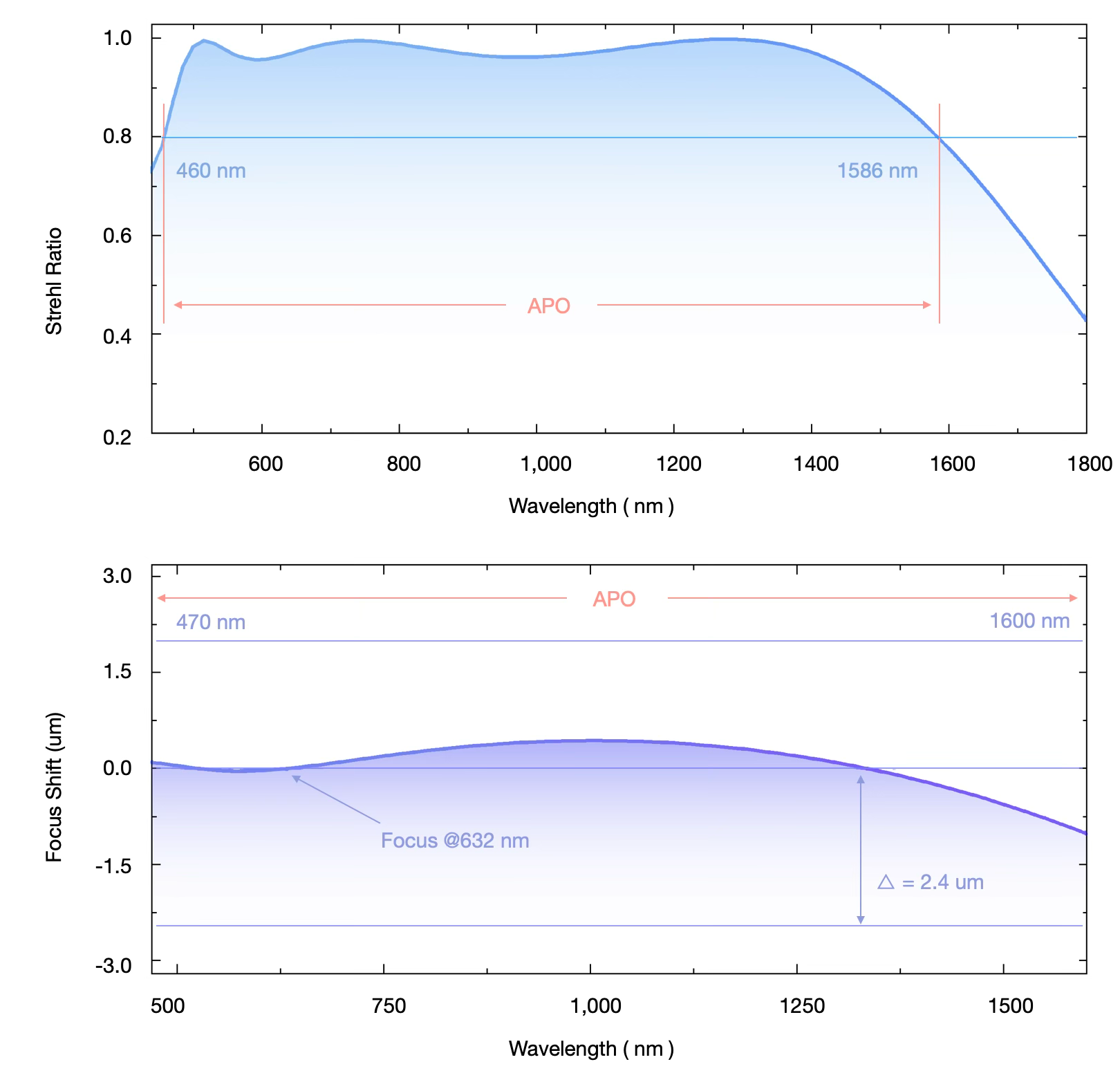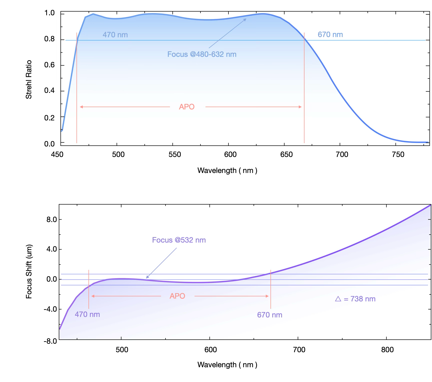 3.Apochromatic Range: The range of wavelengths over which the focal shift (|df|) of light through the objective remains within the depth of focus (Δ = λ / 2 × N.A.²), ensuring imaging quality is unaffected. Wavelengths satisfying |df| < Δ are considered within the apochromatic range.