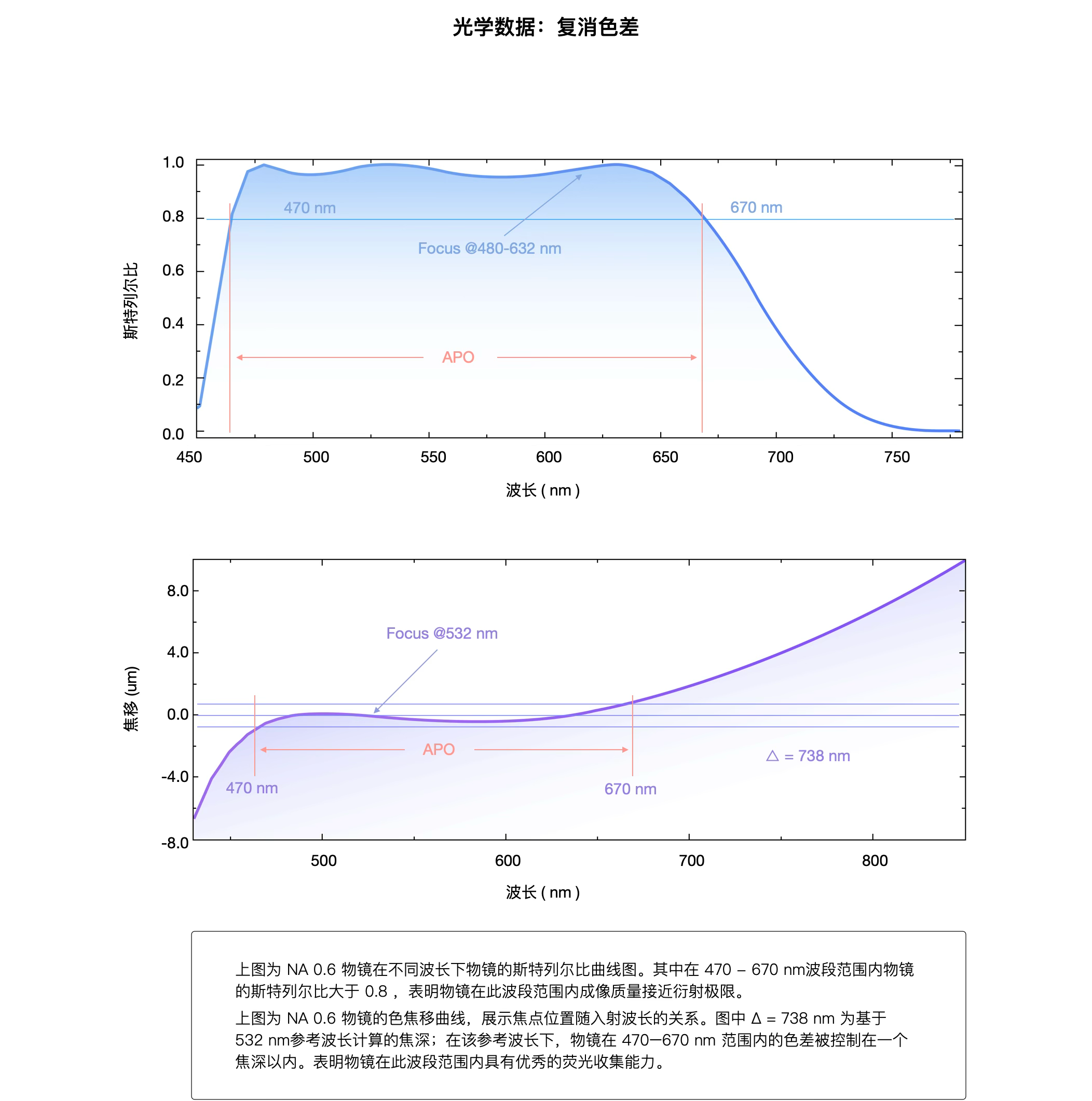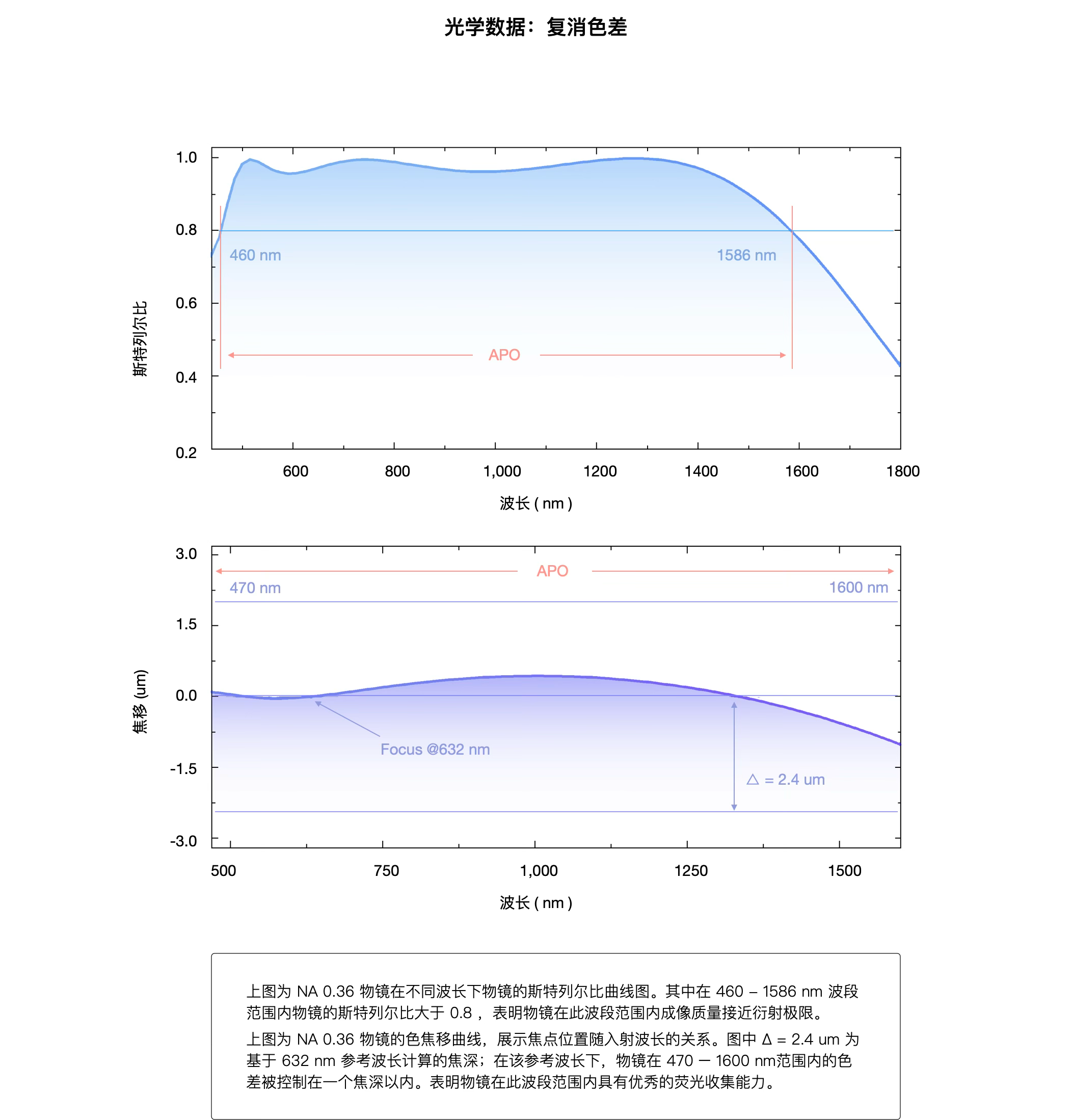 3.Apochromatic Range: The range of wavelengths over which the focal shift (|df|) of light through the objective remains within the depth of focus (Δ = λ / 2 × N.A.²), ensuring imaging quality is unaffected. Wavelengths satisfying |df| < Δ are considered within the apochromatic range.
