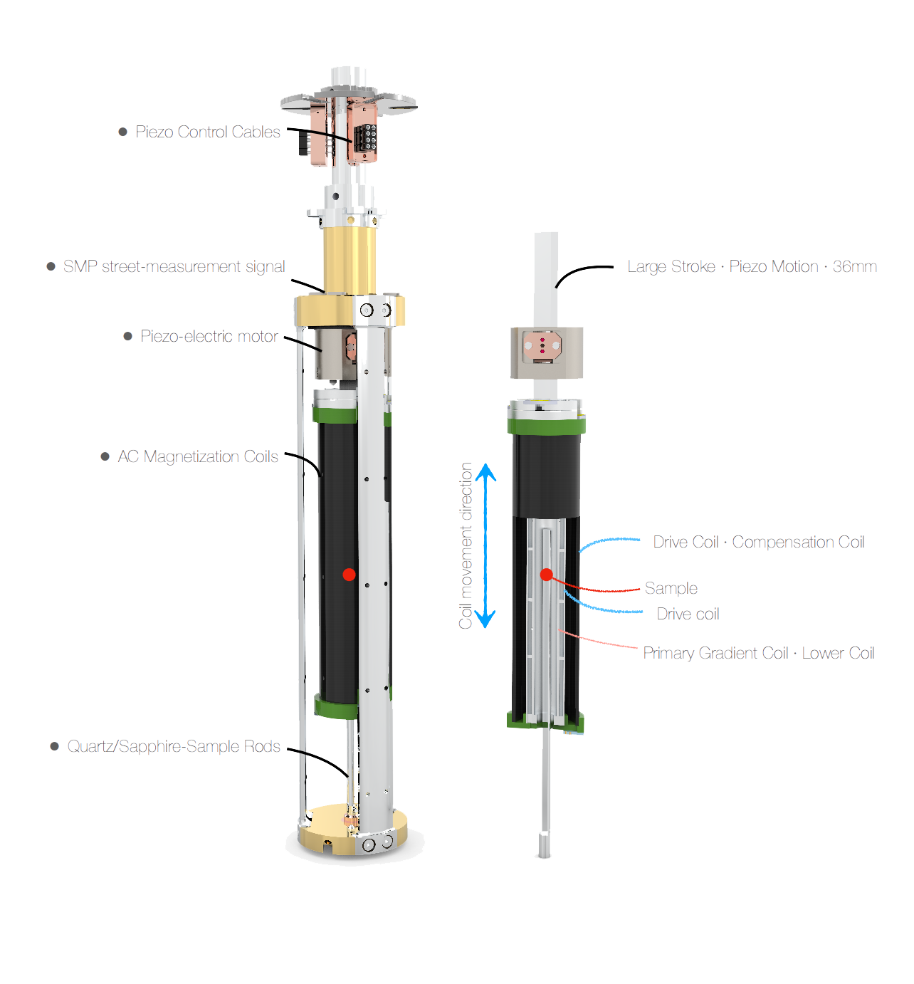 Because the measurement algorithm requires the sample to be moved three/five times during the measurement process, Multifield Technology has placed the power module directly into a cryogenic environment, rather than the traditional solution of placing the electromagnetic motor at room temperature and carrying the sample through the chamber by means of a 1m-long sample rod.
