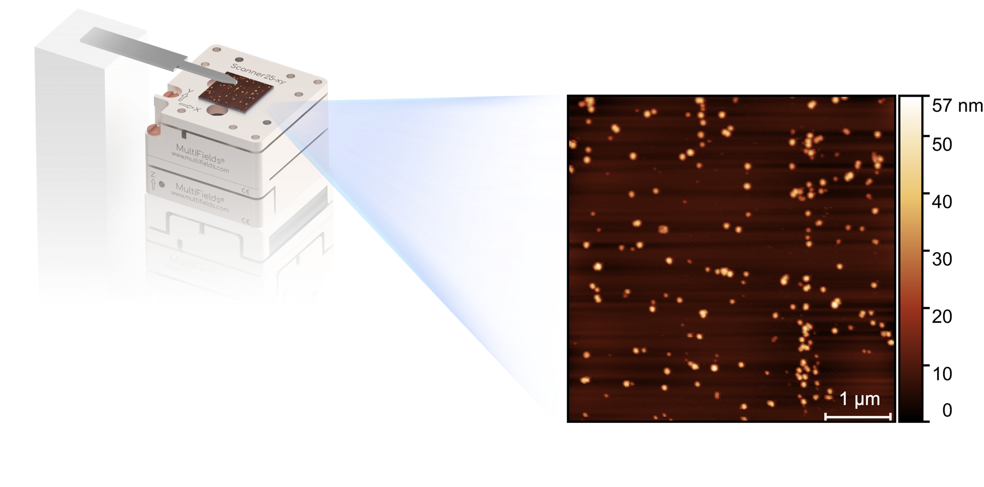 1图中数据为使用多场开环扫描台Scanner25-xy、Scanner25-z、扫描台控制器MC-ArchimedesLT.03、ColdTABLE低温系统及商用AFM控制器获得的蓝宝石衬底上银纳米颗粒的表面形貌,颗粒的典型直径为30~50 nm。
